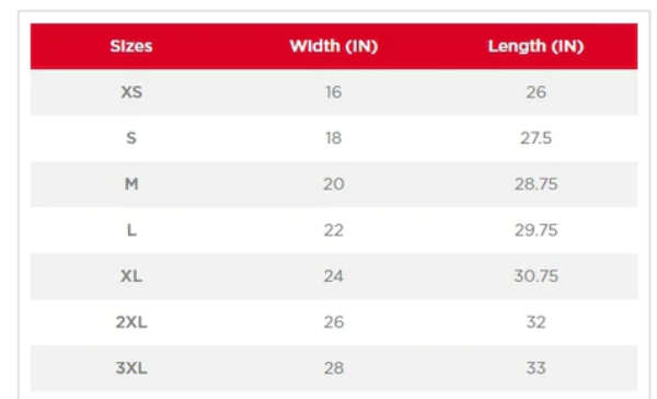 Body Length 26 ½ 28 29 ¼ 30 ¼ 31 ¼ 32 ½ 33 ½ 34 ½